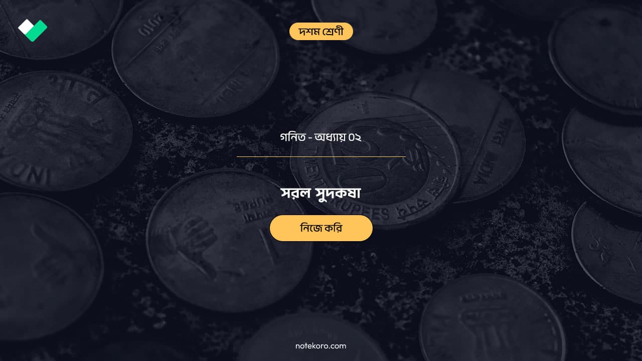 দশম শ্রেণীর গণিত Chapter 02 – Nije Kori (Simple Interest / সরল সুদ) অধ্যায়ের প্রশ্নোত্তর নিয়ে এই সমাধান তৈরি করা হয়েছে। এখানে ধাপে ধাপে সমাধান, সূত্রের ব্যবহার, উদাহরণসহ ব্যাখ্যা এবং পরীক্ষায় উপযোগী প্রশ্নোত্তর অন্তর্ভুক্ত করা হয়েছে। শিক্ষার্থীরা যাতে নিজেরাই সহজে গণনা করতে পারে এবং সরল সুদের ধারণা পরিষ্কারভাবে বুঝতে পারে, সেই উদ্দেশ্যে প্রতিটি সমস্যা সহজ ভাষায়, যুক্তিনির্ভর ব্যাখ্যা ও সঠিক সমাধানসহ তুলে ধরা হয়েছে। এই গাইডটি অনুশীলন, পরীক্ষা প্রস্তুতি এবং গণিতের বুনিয়াদ আরও শক্ত করতে কার্যকর ভূমিকা রাখবে।